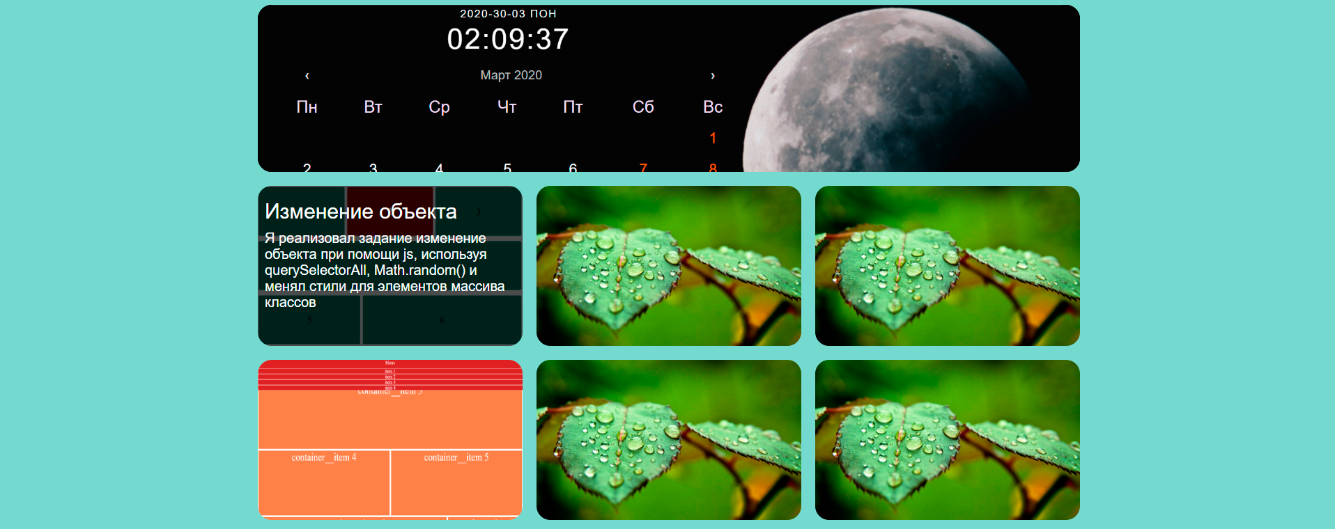 Я реализовал задание изменение объекта при помощи js, используя querySelectorAll, Math.random() и менял стили для элементов массива классов